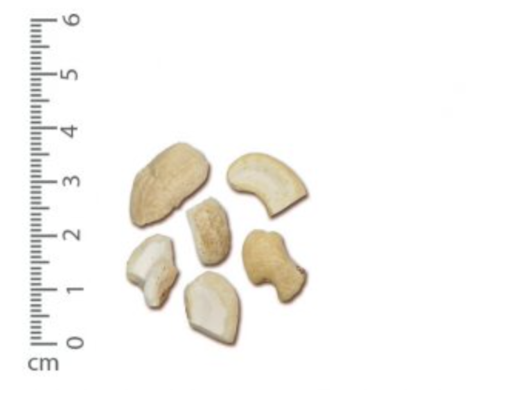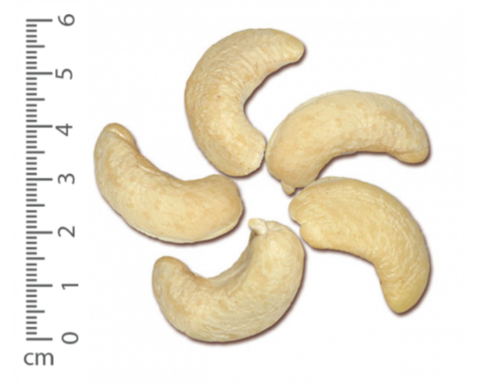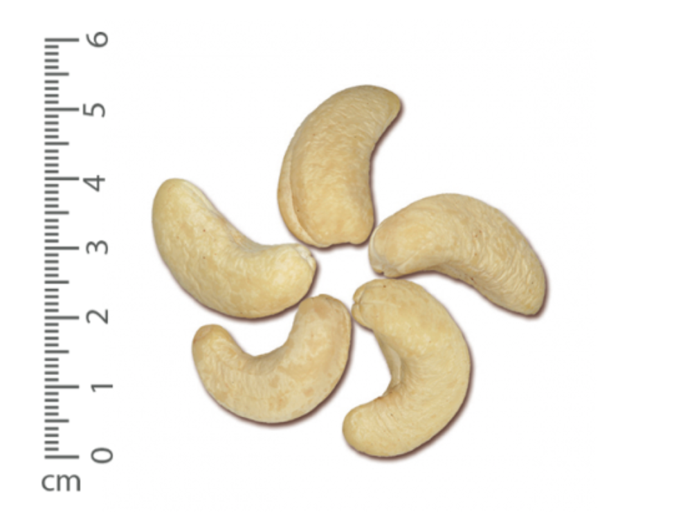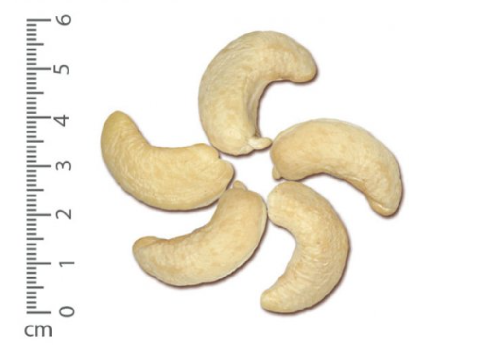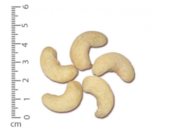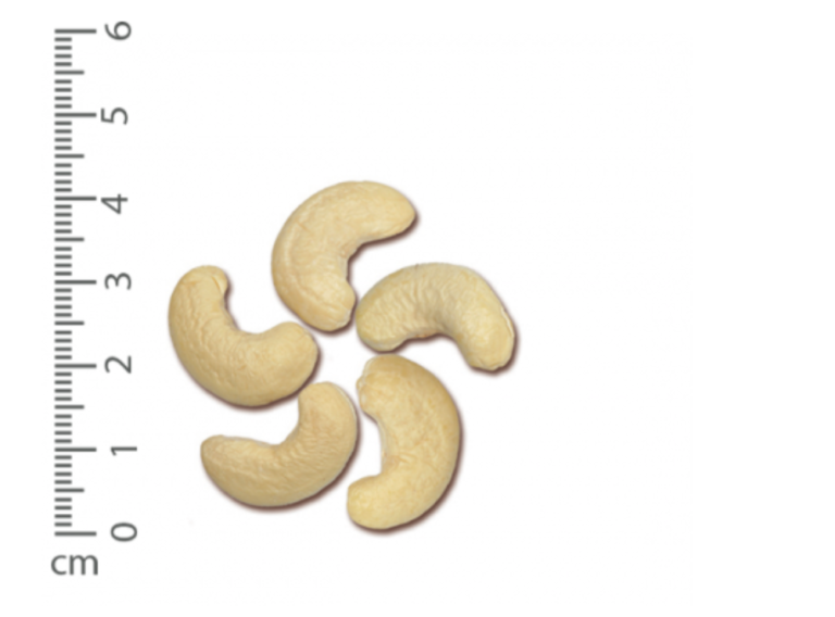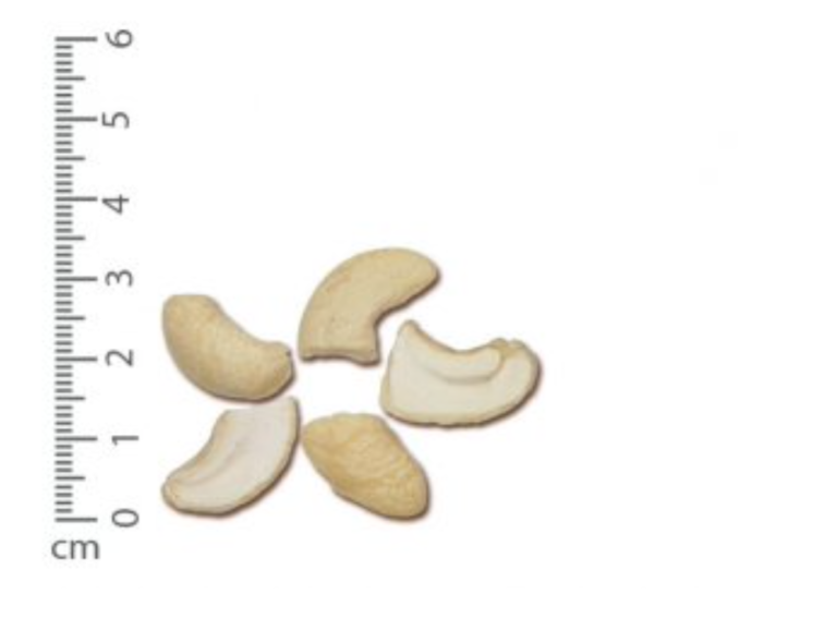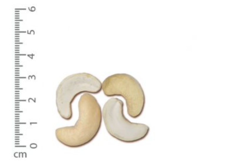 Size description: One half of a cashew kernel that has been split lengthwise, provided not more than 1/8 of this cotyledon has been broken off.